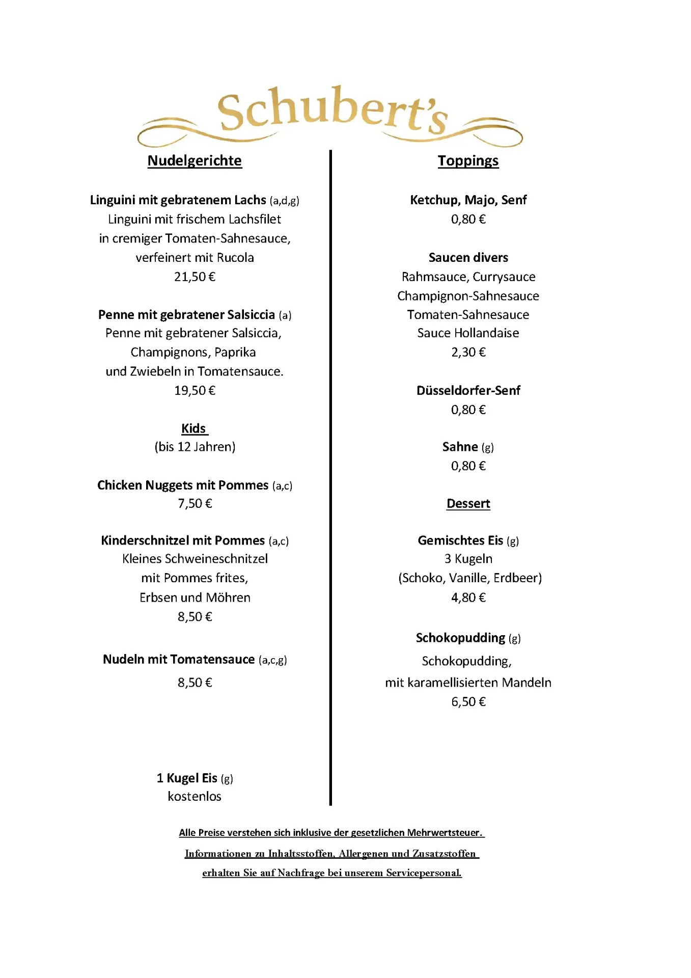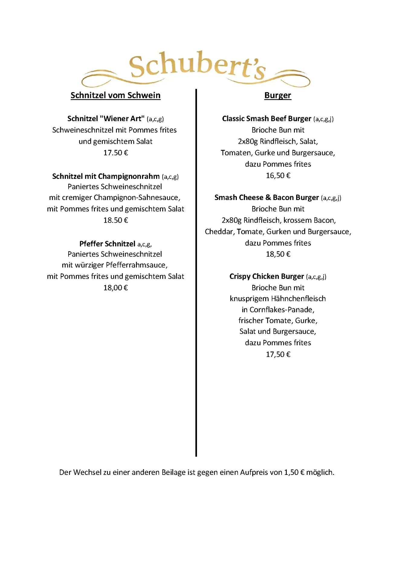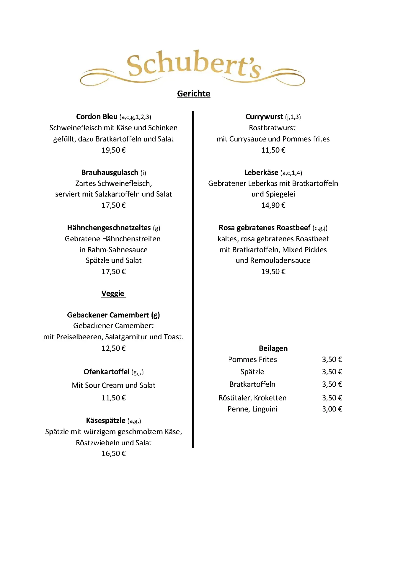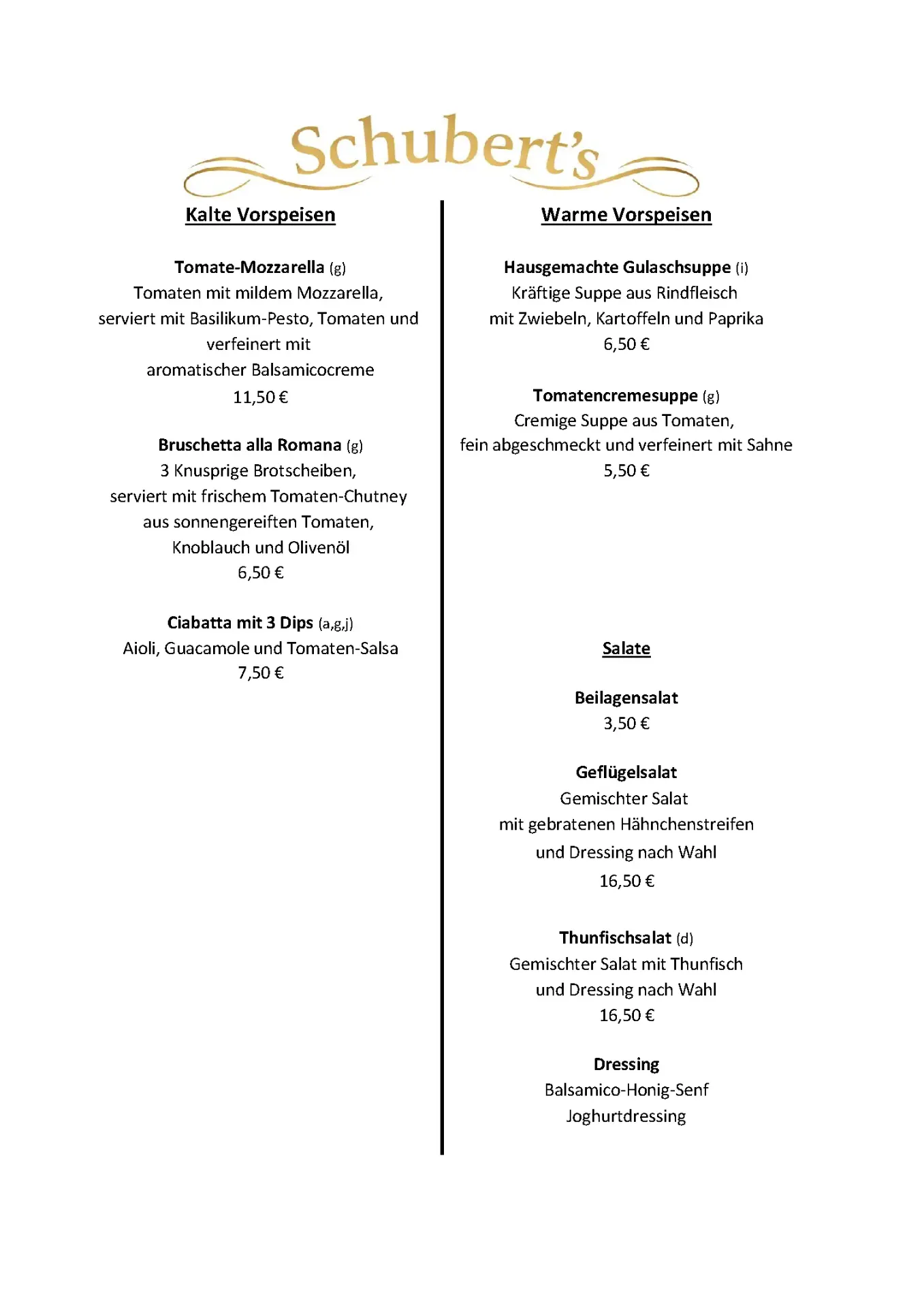 Schubert´s – die Speisekarte